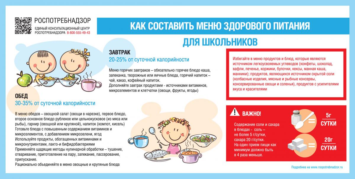 Роспотребнадзором разработаны методические рекомендации по организации питания обучающихся общеобразовательных организаций, которые направлены на организацию здорового питания, в том числе горячего, формирование принципов рационального, сбалансированного питания при оказании услуг по организации питания. В документе реализованы принципы здорового питания, в том числе включающие уменьшение количества потребляемых кондитерских и колбасных изделий, сахара и соли. В методических рекомендациях предложены варианты базового меню для разработки региональных типовых меню, учитывающих территориальные, национальные и другие особенности питания населения.