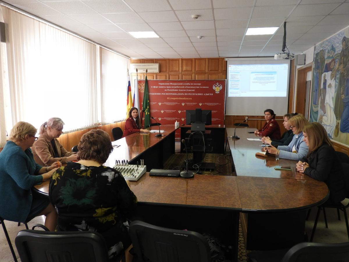 В Управлении Роспотребнадзора по Республике Адыгея 18 октября 2022года прошел семинар для работников предприятий розничной торговли пищевыми продуктами по вопросам соблюдения требований законодательства о санитарно-эпидемиологическом благополучии населения, осуществлению производственного контроля за соответствием пищевой продукции стандартам, техническим регламентам и техническим условиям. В работе семинара приняли участие торговые предприятия республики. С докладом об обязательных требованиях, предъявляемых к деятельности контролируемых лиц и принадлежащим им объектам контроля, риск-ориентированном контроле безопасности пищевой продукции, новеллах в организации контрольных (надзорных) мероприятий выступила заместитель начальника отдела санитарного надзора Коваленко Инесса Станиславовна.
