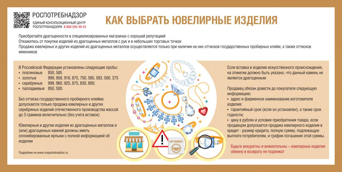 Роспотребнадзор напоминает, что для того чтобы правильно выбрать ювелирное изделие, необходимо быть внимательными и приобретать украшения в специализированных магазинах с хорошей репутацией.