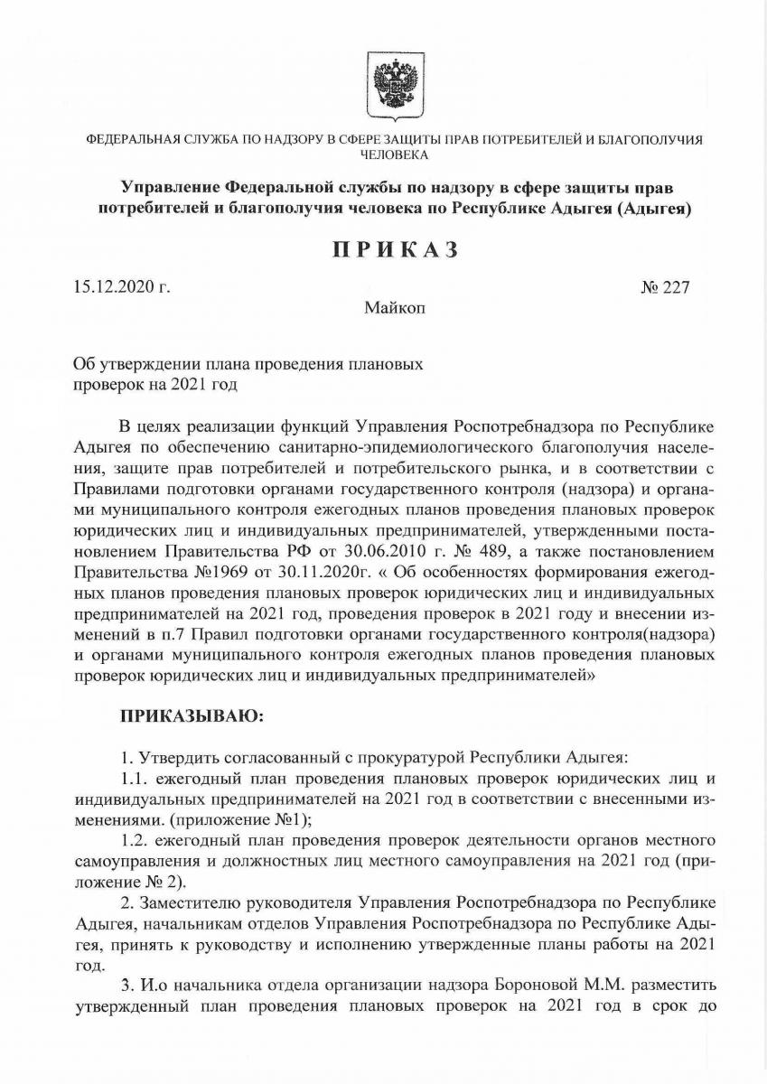 Приказ об утверждении Плана проведения плановых проверок на 2021 год