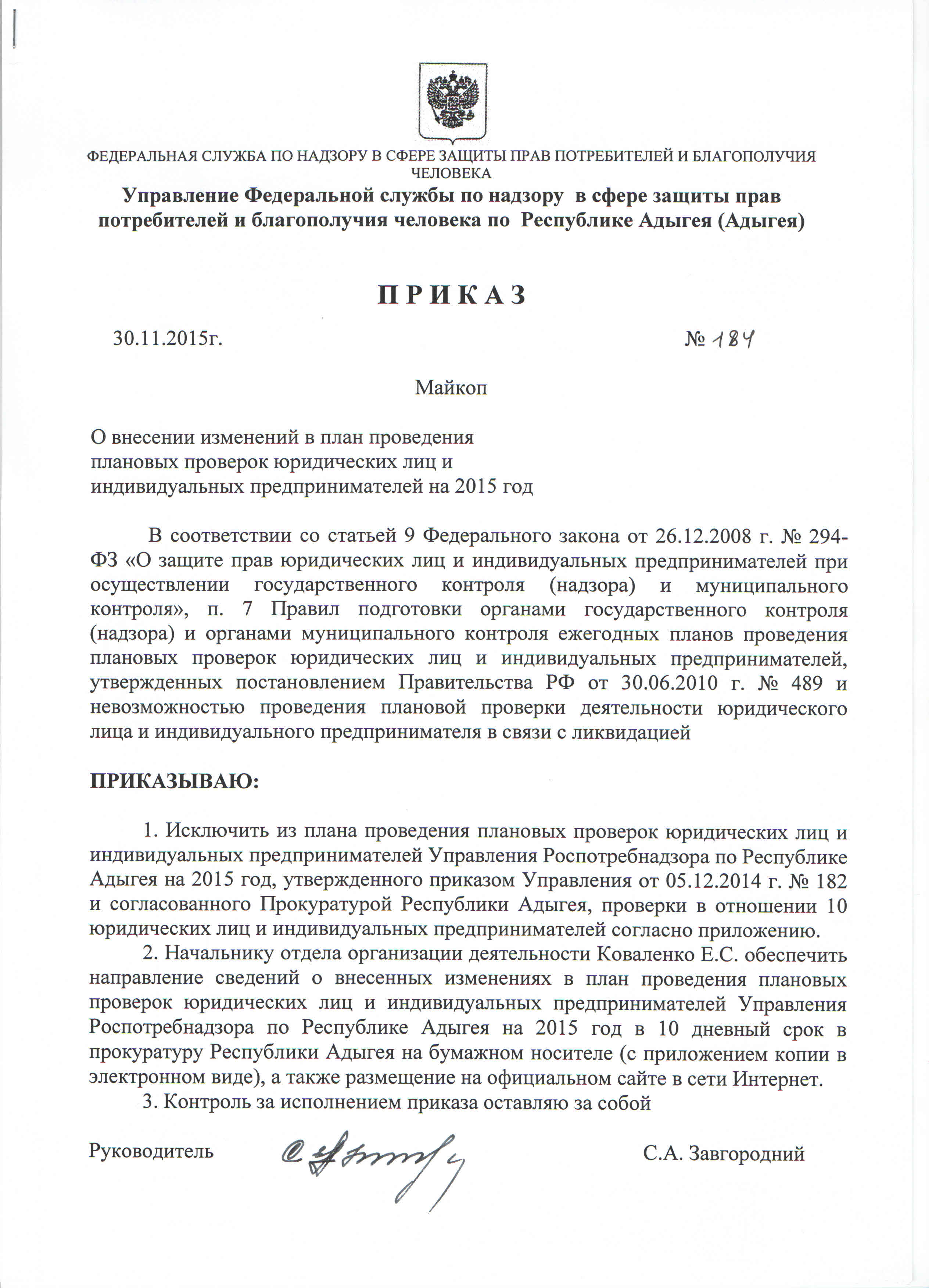 2. Начальнику отдела организации деятельности Коваленко Е.С. обеспечить направление сведений о внесенных изменениях в план проведения плановых проверок юридических лиц и индивидуальных предпринимателей Управления Роспотребнадзора по Республике Адыгея на 2015 год в 10 дневный срок в прокуратуру Республики Адыгея на бумажном носителе (с приложением копии в электронном виде), а также размещение на официальном сайте в сети Интернет.