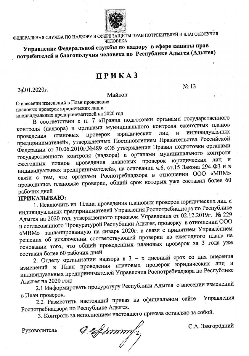 Приказ № 13 "О внесении изменений в План проведения плановых проверок юридических лиц и индивидуальных предпринимателей на 2020 год"