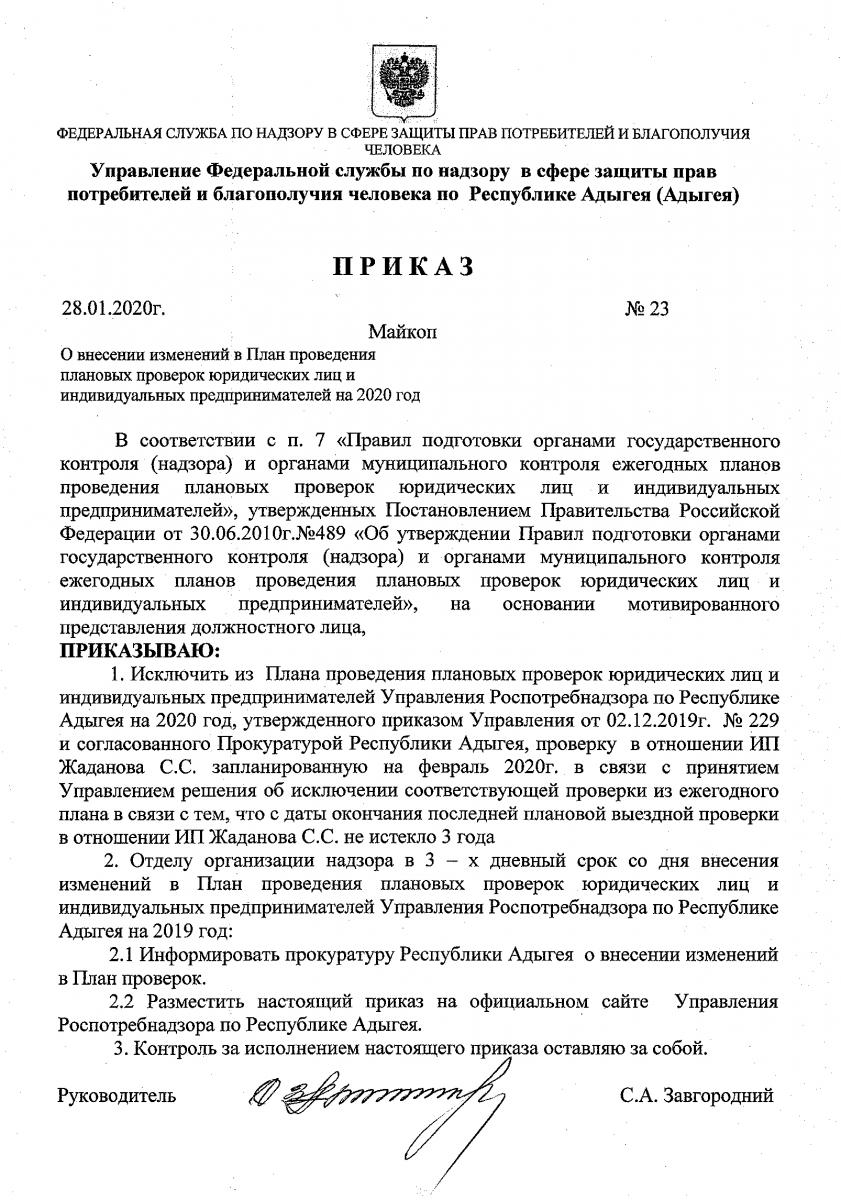 Приказ № 23 "О внесении изменений в План проведения плановых проверок юридических лиц и индивидуальных предпринимателей на 2020 год"