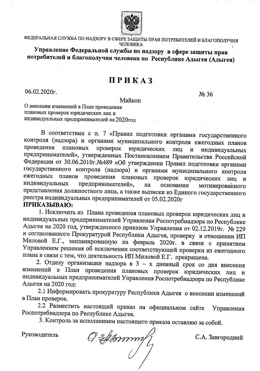 Приказ №36 "О внесении изменений в План проведения плановых проверок юридических лиц и индивидуальных предпринимателей на 2020 год"