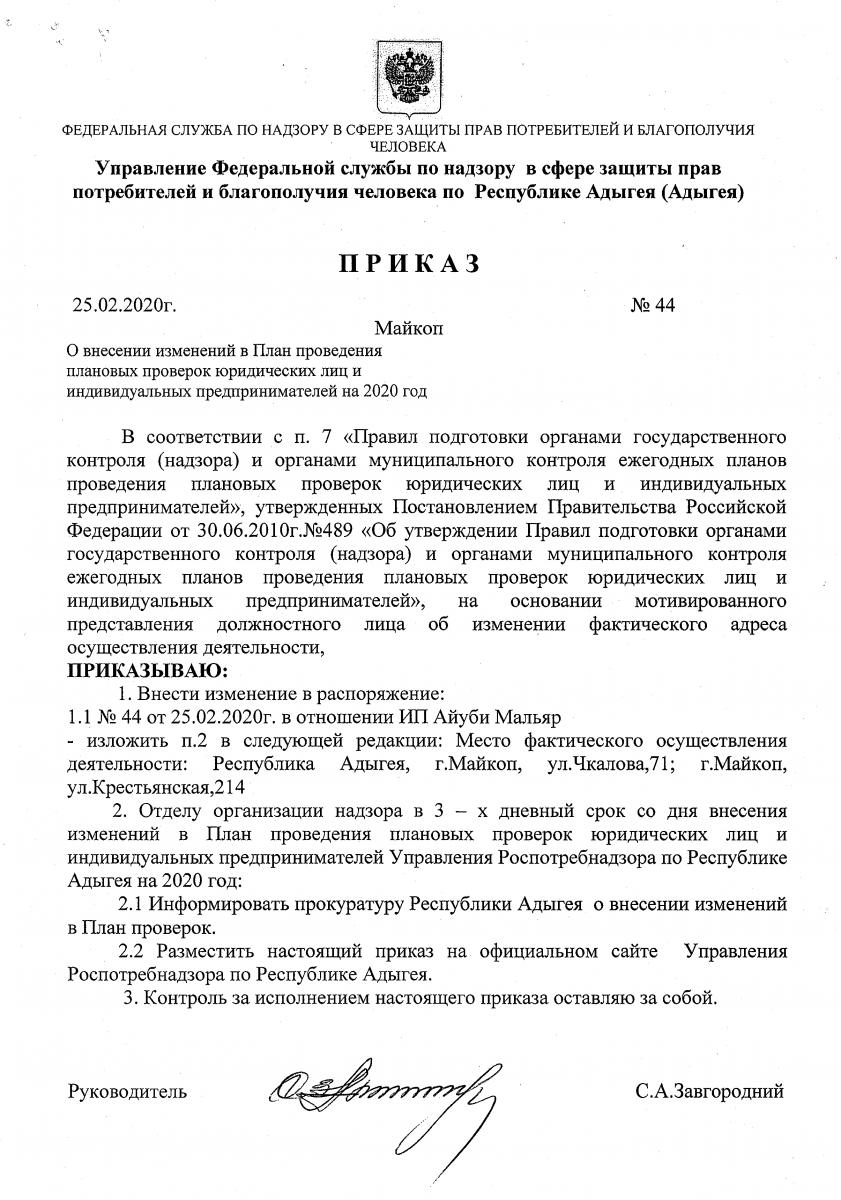 Приказ №44 "О внесении изменений в План проведения плановых проверок юридических лиц и индивидуальных предпринимателей на 2020 год"