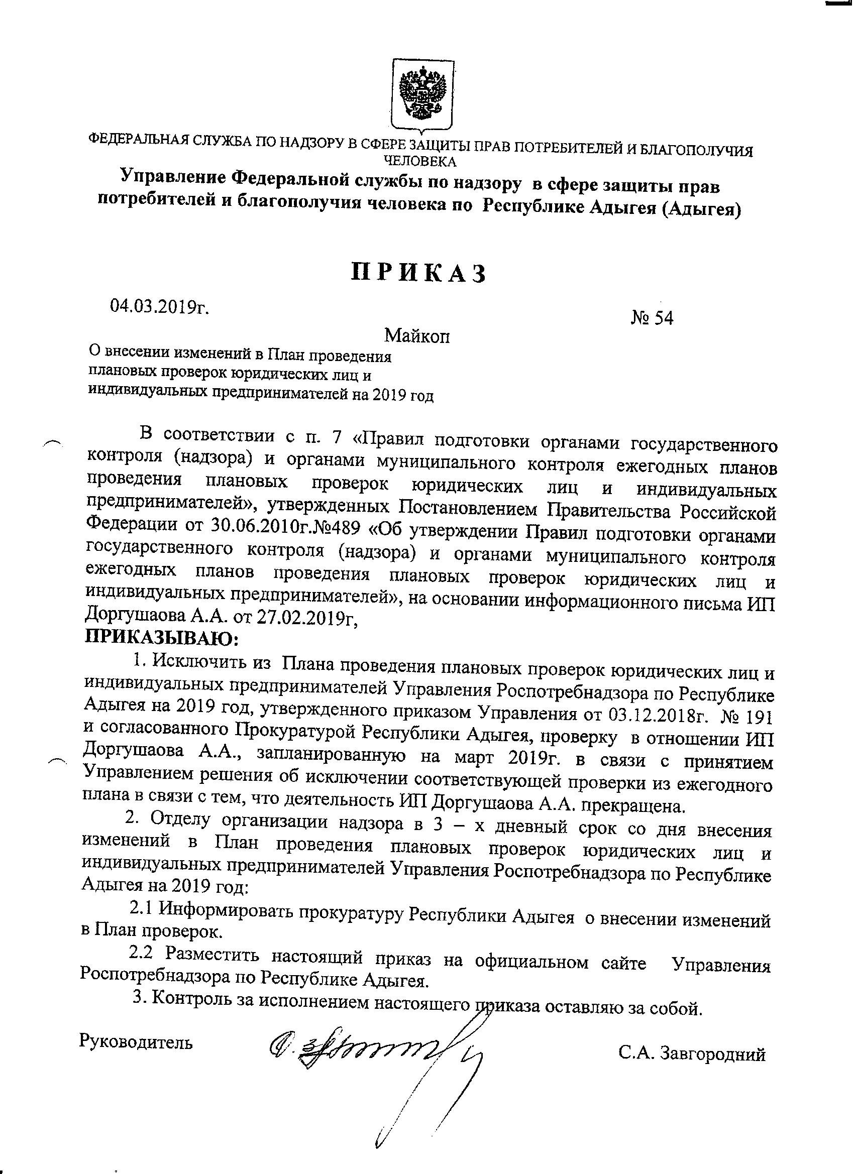 Приказ №54 о внесении изменений в План проведения плановых проверок юридических лиц и индивидуальных предпринимателей на 2019 год
