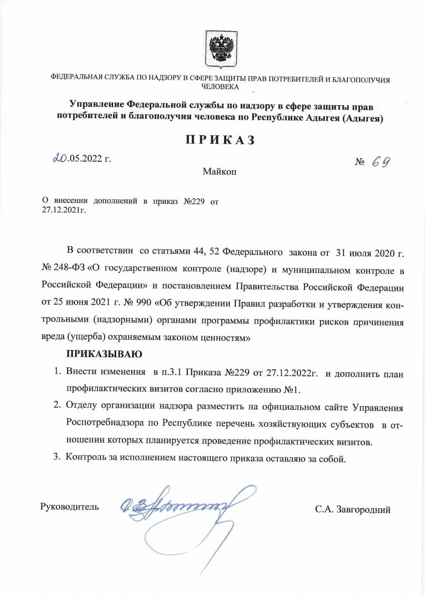 Приказ №69 от 20.05.2022г. "О внесении дополнений в приказ №229 от 27.12.2021г."