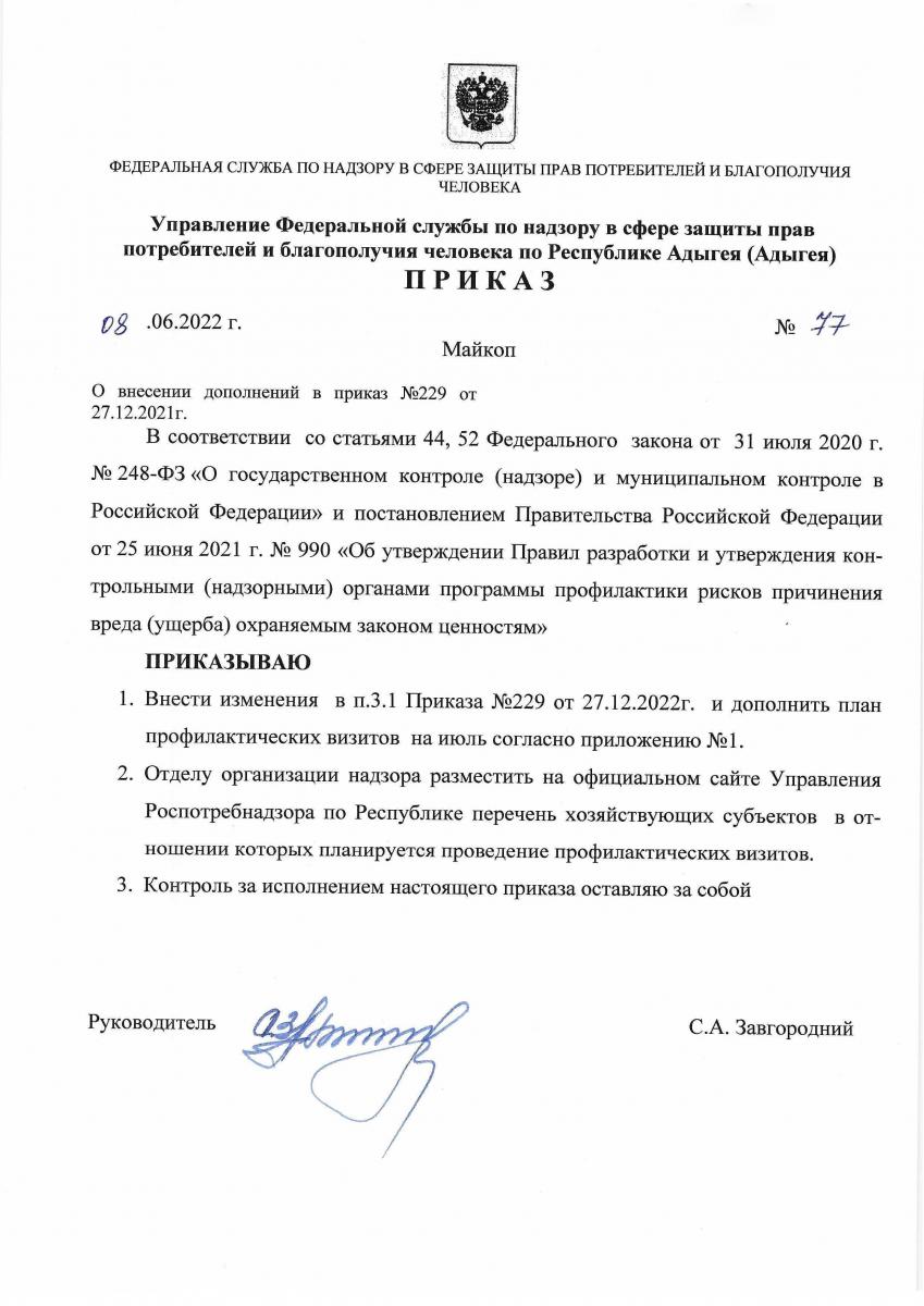 Приказ №77 от 20.05.2022г. "О внесении дополнений в приказ №229 от 27.12.2021г."